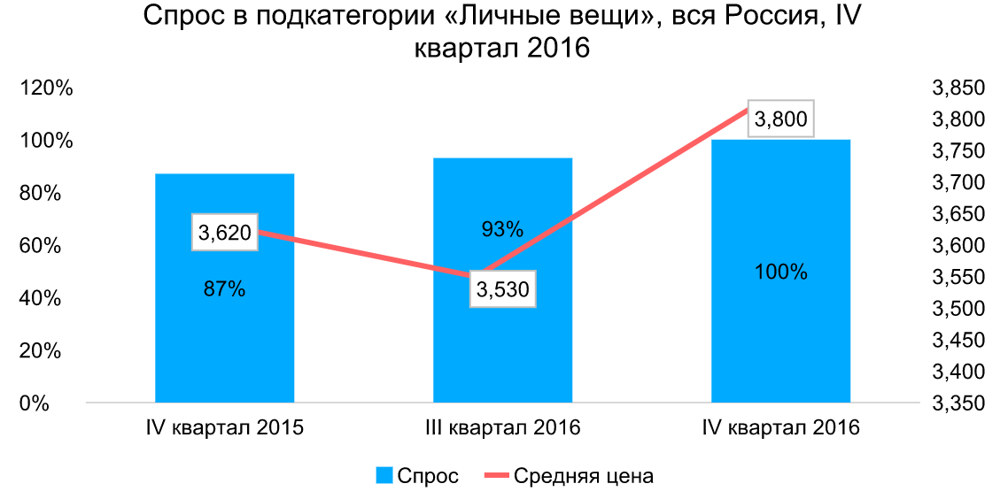 За три месяца интерес к разделу "Личные вещи" вырос на 8%, за год – на 15%. Средняя стоимость товара в подкатегории за год стала выше на 5%, достигнув 3 800 рублей. В этом разделе зафискирована самая низкая средняя цена товаров общего спроса на Avito за последний квартал по России.