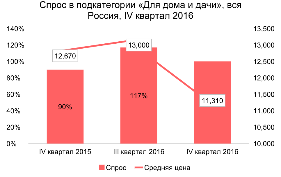 Самая высокая средняя цена товаров общего спроса на Avito за последний квартал – в подкатегории "Для дома и дачи". Средняя стоимость упала за год на 11%, составив 11 310 рублей. В целом за 2015 год интерес к разделу вырос на 11%, а за квартал – снизился на 15%.