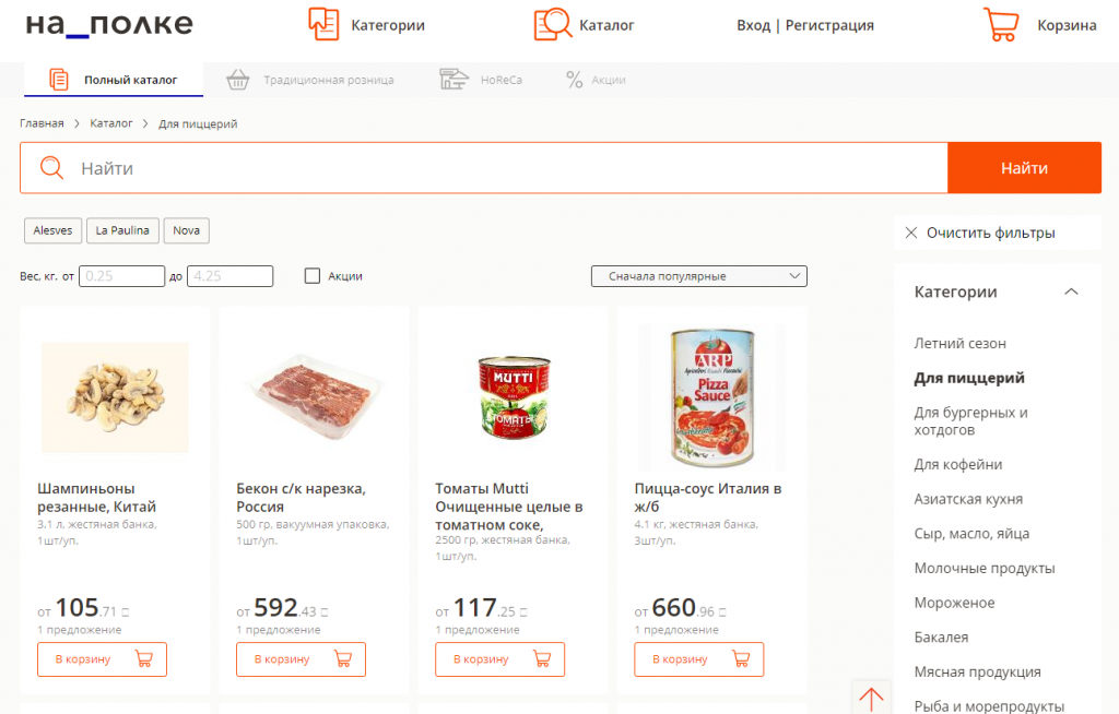Например, в категории "Для кофейни" представлены чипсы, шоколадки, кофе, молоко и подобные товары, а покупатели из пиццерий в своём разделе увидят нарезку салями, тесто для пиццы и так далее.