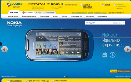 Отличный и показательный пример того, как успешная реализация бизнес идеи перешла и на просторы интернета. Clean and simple - просто и ясно. Вообще ничего лишнего (скорее всего за счет того, что всё об этой фирме мы узнаваЛИ из телевизора). Очень радует внизу кнопки "просмотренные товары", когда что-то вспоминаешь, что смотрел, взгляд сам туда падает. Оплаты только кредитками и наличкой. Помимо интернет магазина, Евросеть предлагает услуги по продаже билетов на самолеты, поезда, концерты и звонки через интернет.