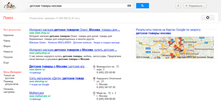 В Москвы сотни детских магазинов, неужели они все будут показываться в этом блоке, спросите вы? Нет, есть несколько хитростей и моментов, которые ограничивают и влияют на то, какие компании будут выводиться в данном списке.