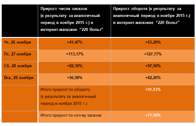 - В целом рост оборота по сравнению с аналогичным периодом в ноябре 2015 г. показал прирост в 91,93%, количество заказов увеличилось на 71,5%. Как и ожидалось, самым ажиотажным днем распродажи стала пятница, 27 ноября.