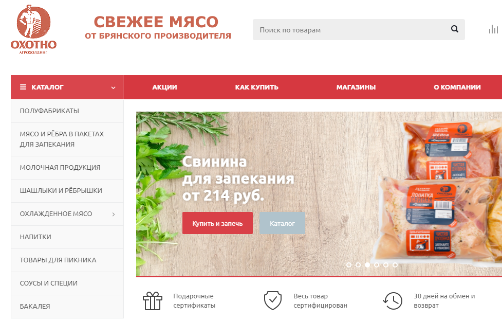 Крупный брянский агрохолдинг "Охотно" запустил доставку на дом свежих мясных продуктов собственного производства из фирменных магазинов. Заказ можно оформить в интернет-магазине ohotnovdom.ru.