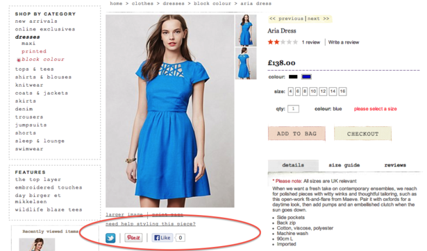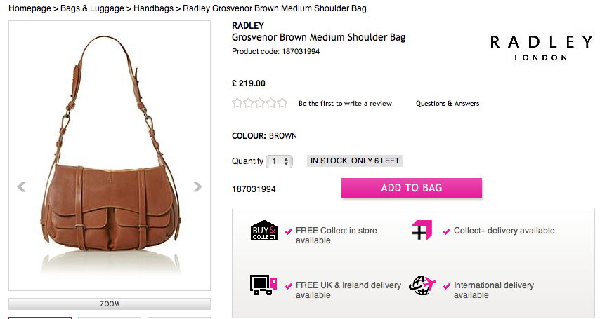 Однозначно, стоит сделать ее весьма заметной на фоне остальных элементов страницы товара. Отличный пример – интернет-магазин House of Fraser, который довольно ярко и броско выделяет эту кнопку, что, на наш взгляд, делает ее более привлекательной для клика.