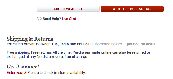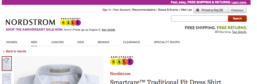 Если вы предлагаете скидку на заказы свыше определенной суммы или предоставляете бесплатную доставку при заказе от НН рублей, то сообщите об этом, как это делается в правом верхнем углу интернет-магазина Nordstorm! Это неплохо поднимает не только конверсию, но и средний чек.