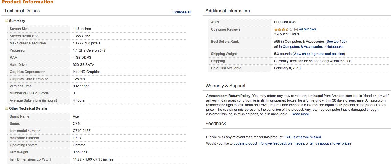Детальными описаниями славится Amazon, который старается по максимуму указать всю имеющуюся у него информацию о продаваемом товаре.