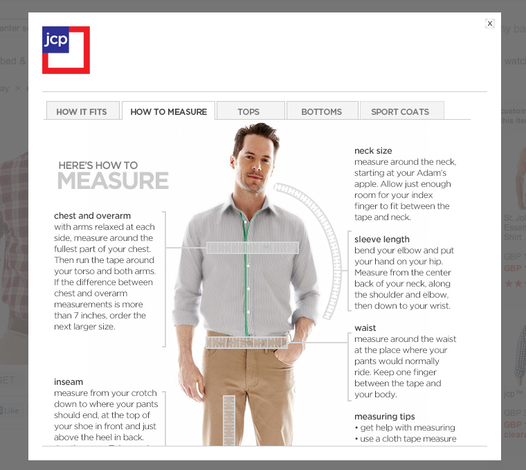 Посмотрите на весьма удачный интернет-магазина JC Penney, который показывает подробное руководство по выбору одежды, которое появляется на странице товара во всплывающем окне.
