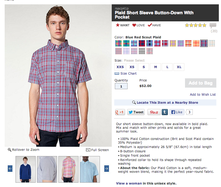 Вот отличный пример от American Apparel. Они дают 18 различных цветов рубашки, каждый из которых представляет из себя отдельный образ.