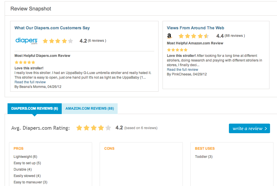 Интернет-магазин Diapers.com показывает все преимущества товара в виде живых клиентских отзывов. Кстати, эту идею также использует Amazon.