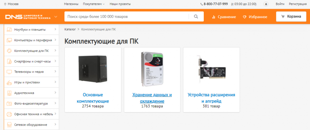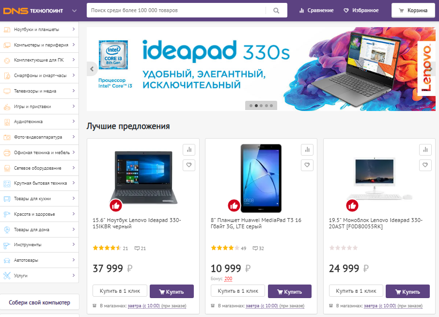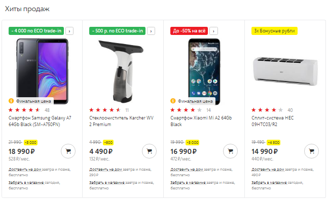 Дискаунтер «DNS Технопоинт» сразу сообщает о своих лучших товарах — блок находится на самом видном месте, его трудно проигнорировать.