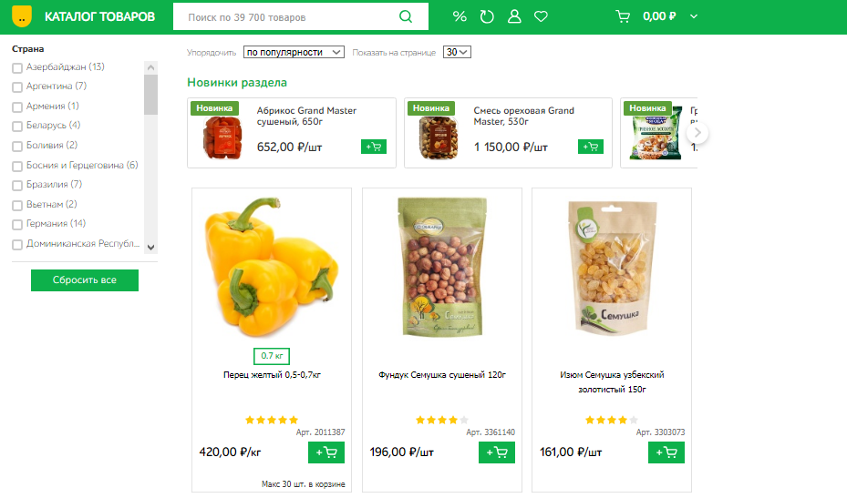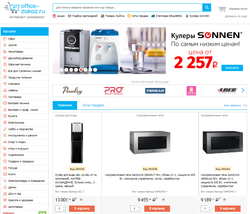 Интересное решение у магазина канцелярских товаров Office-zakaz.ru. Он объединил новинки и популярные товары в рамках одного блока, но разделил их кликабельными разделами.