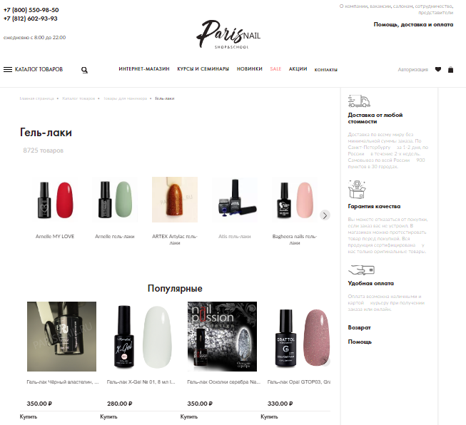 Популярные товары у магазина товаров для ногтей Paris Nail находятся под выдачей, но все равно хорошо просматриваются и со своей задачей справляются.
