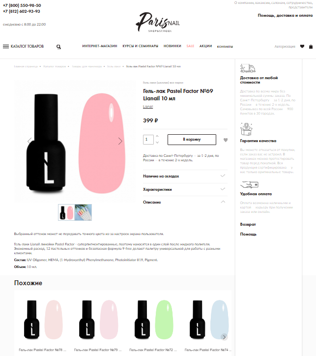 У Paris Nail на странице товара похожие товары находятся сразу под основным. Можно быстро все пролистать и выбрать тот, который больше подходит.