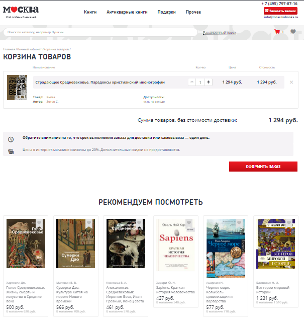 Книжный магазин «Москва» тоже хорошо реализовал блок рекомендаций в корзине, предложив покупателям книги схожей тематики.
