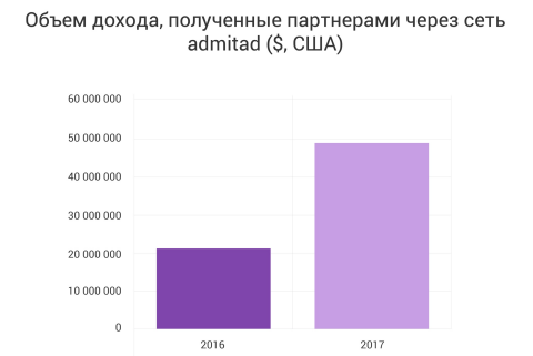 По сравнению с аналогичным периодом 2016 года отмечен значительный рост оборота торговых площадок. Так, доход магазинов, запустивших и продвигающих свои партнерские программы на платформе admitad год к году вырос в 2 раза, увеличившись с $22 млн. до $43 млн. Причиной такого роста стал резко увеличившийся объем покупок. Важно отметить, что в рамках данного исследования под «покупкой» понимается корзина в интернет магазине, оформленная в виде заказа.