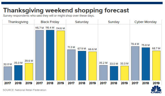Согласно опросу Национальной федерацией розничной торговли (NRF), уже с первой недели ноября покупатели начали совершать праздничные покупки со скидками. Это привело к тому, что уже в начале ноября потребители совершили почти четверть традиционных праздничных покупок, больше всего в истории опросов NRF. В выходные к распродажам в этом году присоединились более 165 миллионов человек.