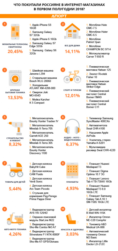 Сервис сравнения цен Aport.RU составил список самых популярных товаров, которые покупали россияне через онлайн в первом полугодии 2018 года. Для анализа были выбраны 10 самых популярных категорий и 5 самых популярных товаров в каждом из сегментов товаров.
