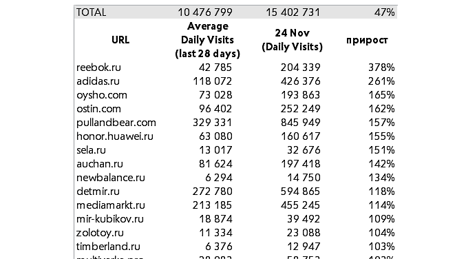 Лидеры прироста — из топ-пула получателей трафика с акционных сайтов “ Чёрная Пятница ”. Абсолютные показатели собственного трафика: