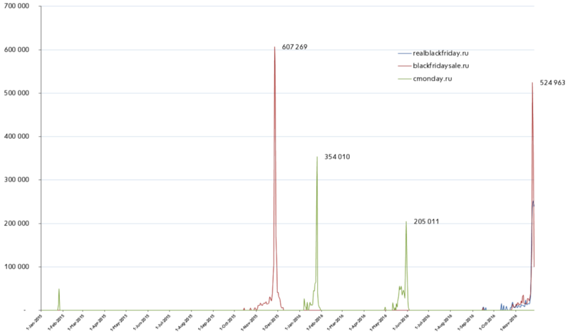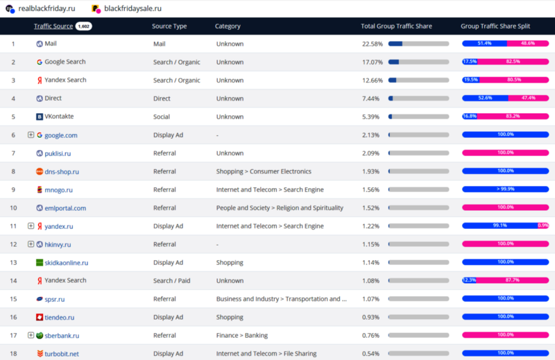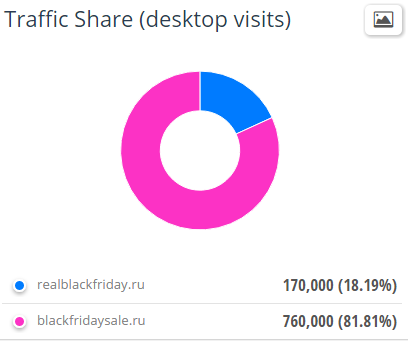 В пике SimilarWeb увидел у blackfridaysale.ru 761 тыс визитов , а у realblackfridaysale.ru — 288 тыс визитов (в 2.64 раза меньше или 38% претендента от лидера ).