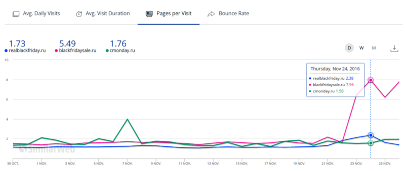 Просмотренных страниц на визит — blackfridaysale.ru просматривают почти 8 страниц на визит , а realblackfriday.ru — 2.38 страницы