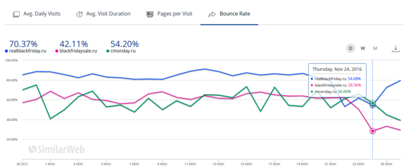 Чуть более 70% трафика на realblackfriday.ru — отказы (или сразу переход на сайт назначения по предложению).