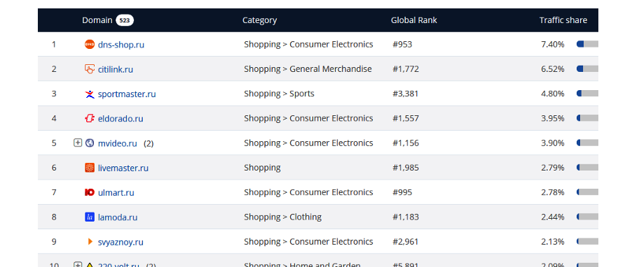 В основном — электронщики в топе, хотя есть и спорт, и Lamoda, 220-вольт (сад и огород, да!).