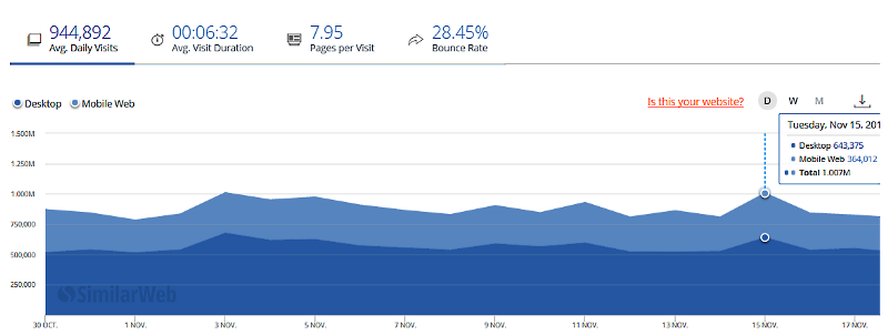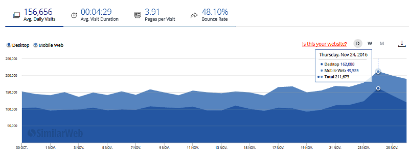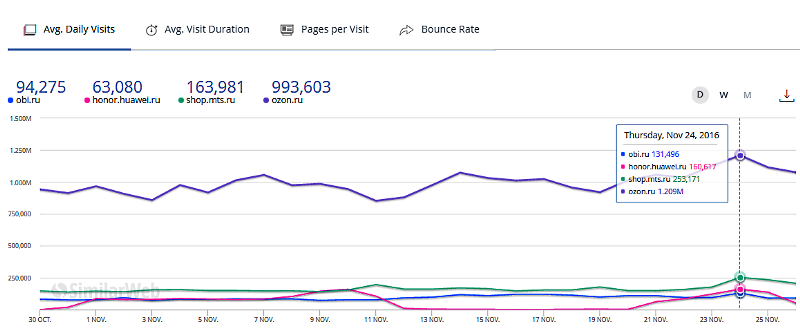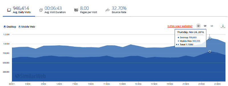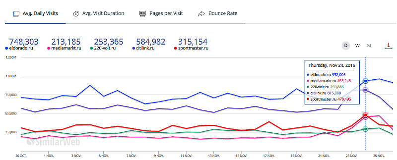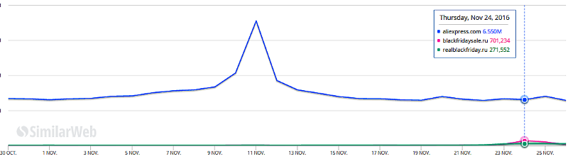 Для сравнения: российский Алиэкспресс 11 ноября 2016 года в день своей “холостяцкой” акции обработал 17.75 млн визитов из России , по сравнению с примыкающими днями в районе 7 млн визитов среднесуточно.