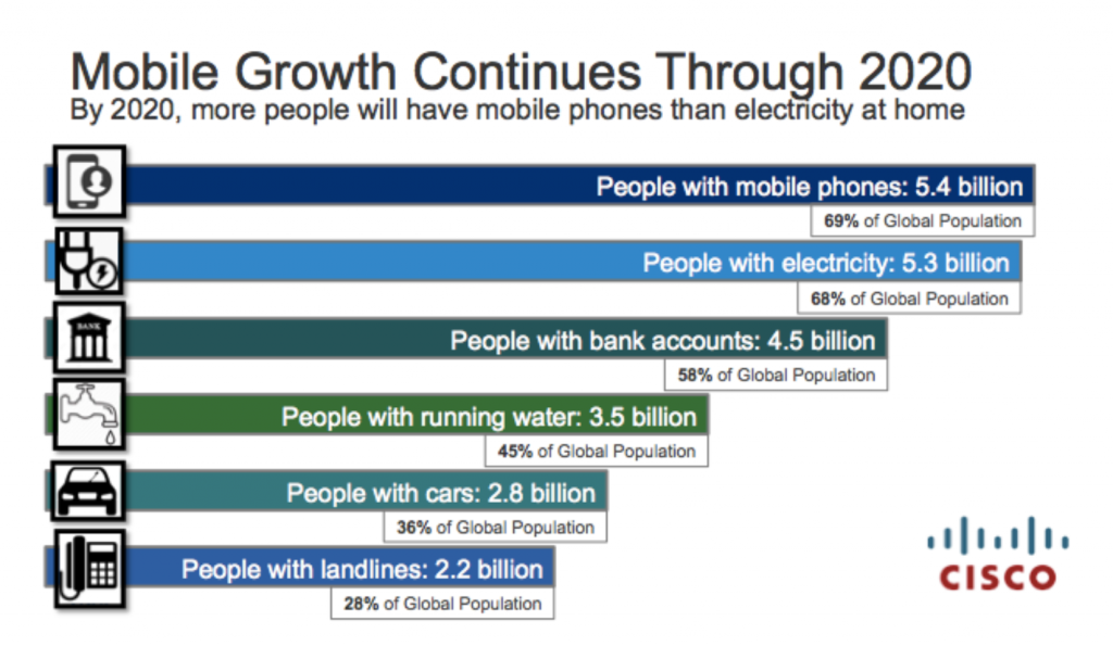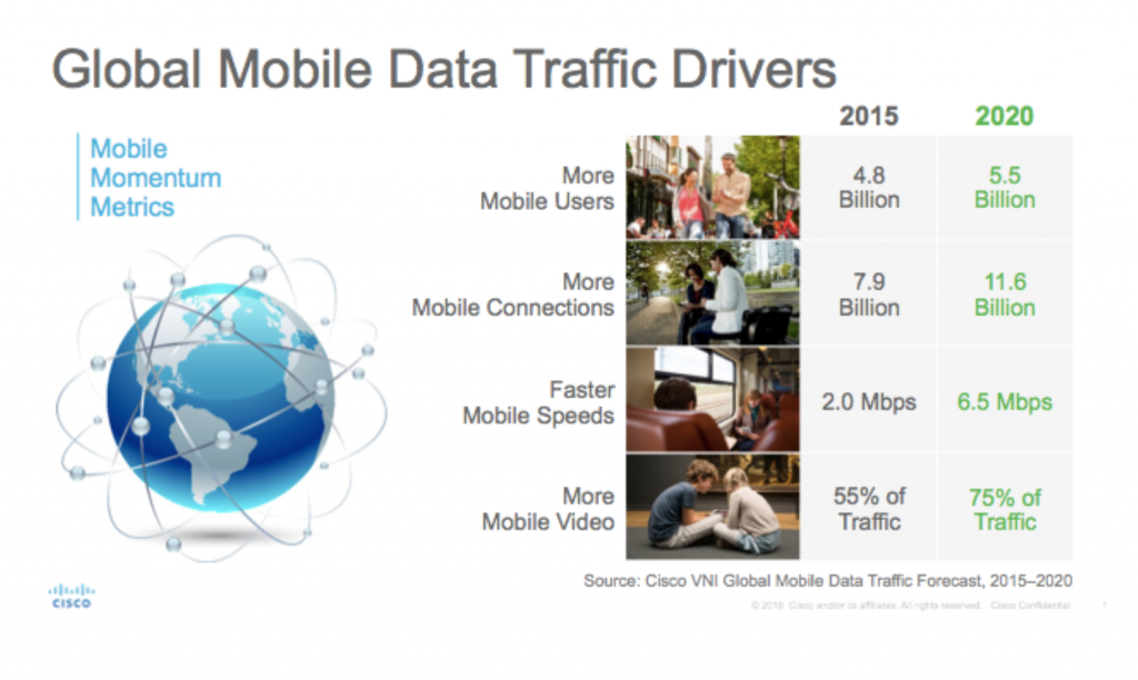 Доля населения, использующего мобильную связь, достигнет 70% или 5,5 млрд человек к 2020 году, согласно отчету Cisco «Наглядный индекс развития сетевых технологий: глобальный прогноз по мобильному трафику на период 2015-2020 гг.»(Cisco Visual Networking Index™ (VNI) Global Mobile Data Traffic Forecast [2015 to 2020]).