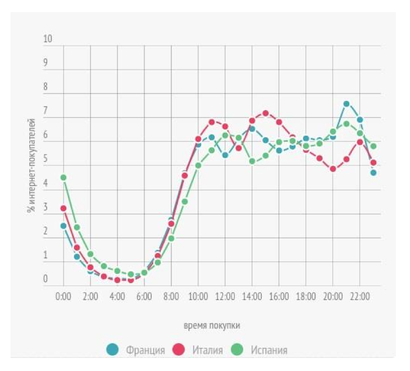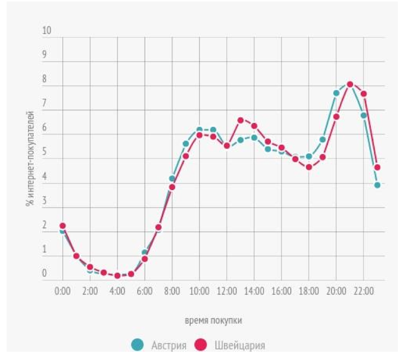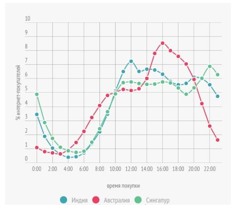 Пользователи в одних странах совершают больше всего покупок в рабочее время, в других – вечером, перед сном.