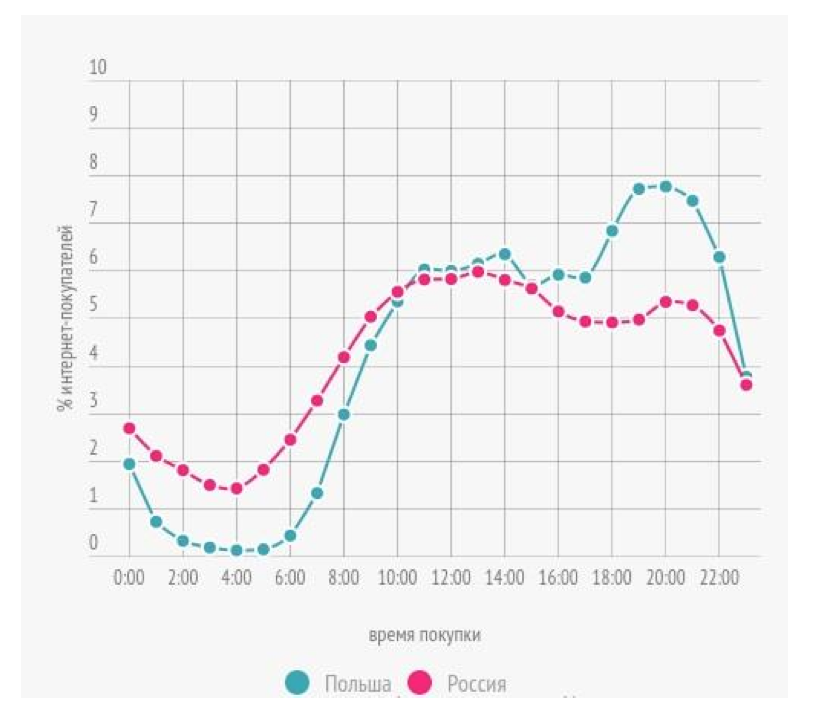 В Польше пик активных покупок начинается в 5 часов вечера и продолжается до 10 вечера.