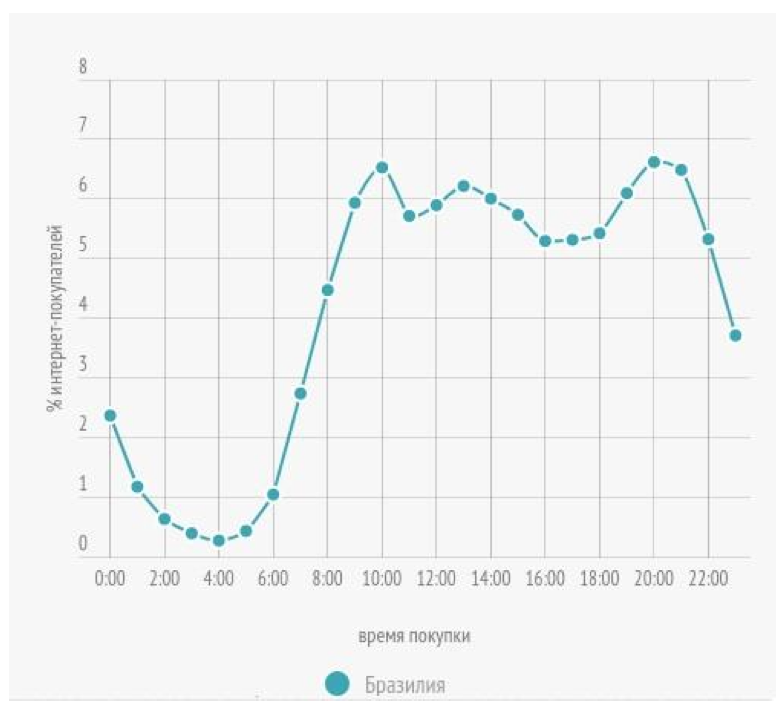 Бразилия очень похожа на Испанию: покупки в интернете совершаются в течение всего дня, пики активности выпадают на 10 утра и 8 вечера.