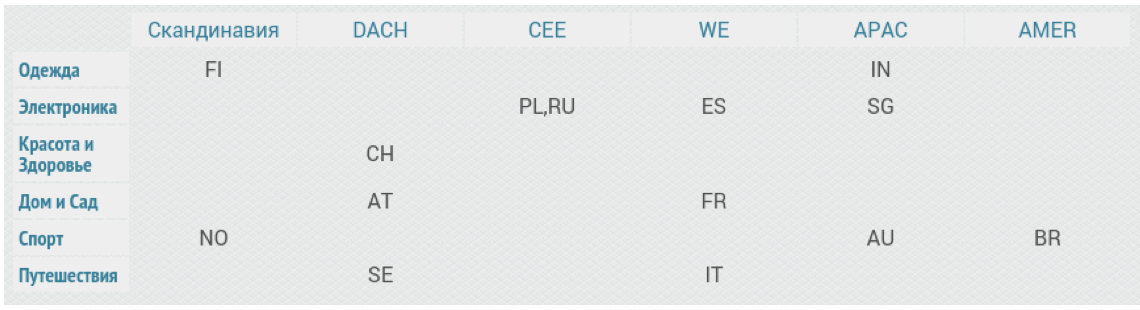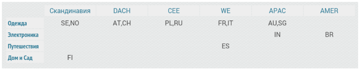 WE – Западная Европа: Франция (FR), Италия (IT), Испания (ES) APAC – Индия (IN), Австралия (AU), Сингапур (SG)