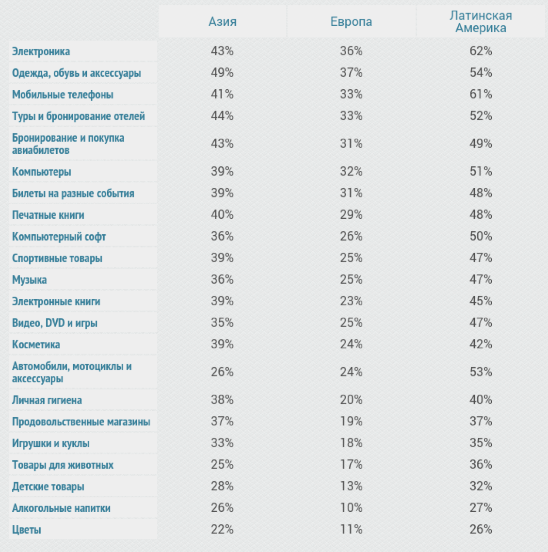 Большинство покупок на мировом рынке совершается сегодня именно в категории «Мода». В 10 из 14 странах эта категория лидирует, на втором месте стоит электроника.