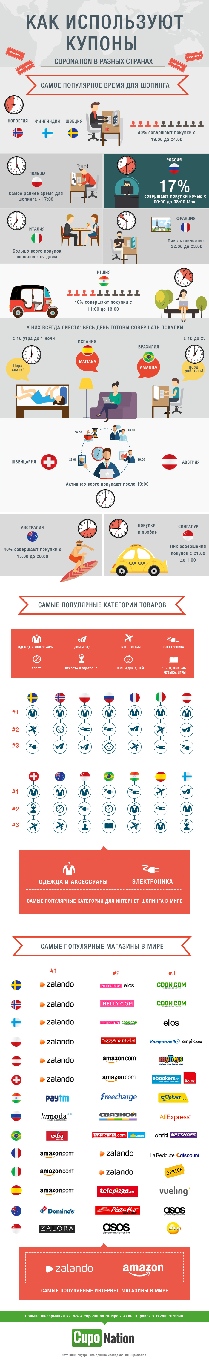 В исследовании, основанном на статистике компании Cuponation, действующей в 16 странах, собраны интересные факты и различия в поведении людей, пользующихся бесплатными купонами при совершении покупок в разных уголках мира.