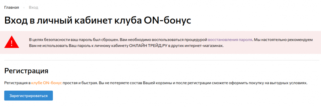 Клиенты, которые пытаются войти на сайт компании, получают предупреждение от магазина о том, что необходимо ввести новый пароль.