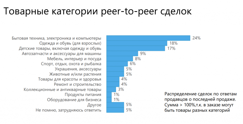 Наиболее продаваемые товарные категории на С2С-рынке — "Электроника и бытовая техника" (24% сделок), "Одежда и обувь" (18%), "Детские товары" (17%). Доля сделок с новыми товарами достигла 15% в общем количестве peer-to-peer сделок. Выше всего доля сделок с покупкой новых товаров в категориях "Товары для красоты и здоровья" и "Аксессуары".