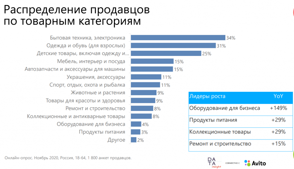 Растёт число продавцов, которые продают оборудование для бизнеса (+149%), продукты питания (+29%) и коллекционные товары (+29%). Впрочем, надо сказать, что сама доля таких продавцов не очень велика, поэтому речь идёт о низкой базе для роста.