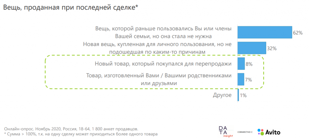 Существенно выросла доля продажи новых товаров. Доля подобных сделок достигла 15% в общем количестве peer-to-peer сделок. Доля продавцов, торгующих новыми товарами, которые были куплены для перепродажи, увеличилась в 1,5 раза с 8% в 2017 г. до 12% в 2020 г. Доля продающих вещи, бывшие в употреблении, продолжает снижаться: 80% продавцов в 2017 г., 70% в 2019 г. и 66% в 2020 г. При этом 85% покупателей классифайдов за последние полгода покупали на них новые товары. А 32% покупали только новые вещи.