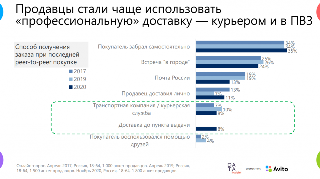Эксперты связывают распространение ареала продажи с широким доступом продавцов к профессиональной доставке. В 2020 г. 16% заказов приходятся на курьерскую доставку и доставку до ПВЗ, еще 13% — на Почту России.