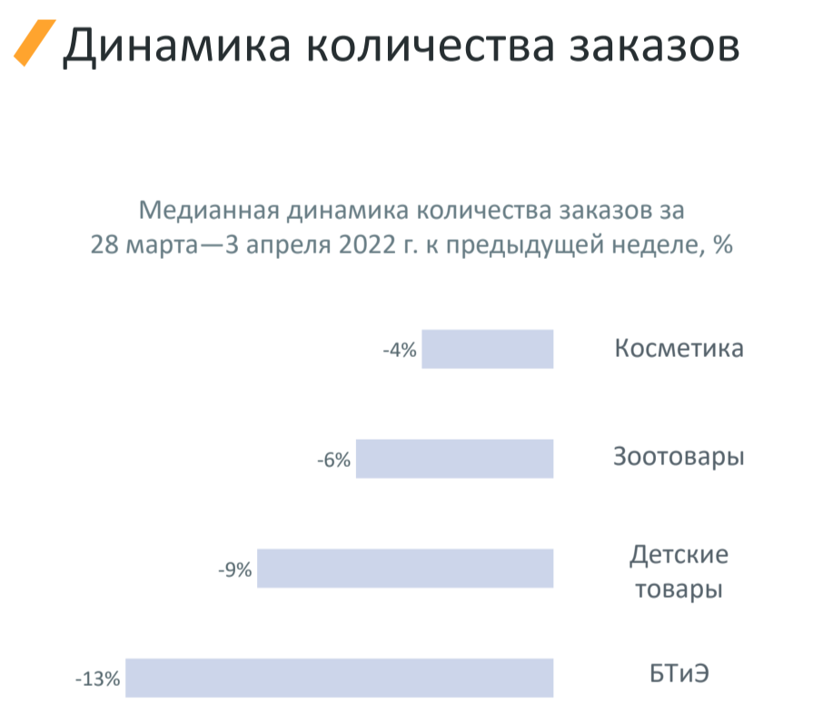Лидером по конверсии остаётся сегмент зоотоваров — за последнюю неделю конверсия составила 10,7%. Наиболее стабильными по доступности товаров также являются магазины зоотоваров – количество товаров во всех категориях к концу недели выросло. Наибольшие колебания доступности происходят среди детских товаров: так, после выходных, 4 апреля количество доступных товаров на Ozon и Wildberries в категории "подгузники HUGGIES" выросло на 19% по отношению к предыдущему дню, а количество детских смесей фирмы "Беллакт" сократилось на 18%.