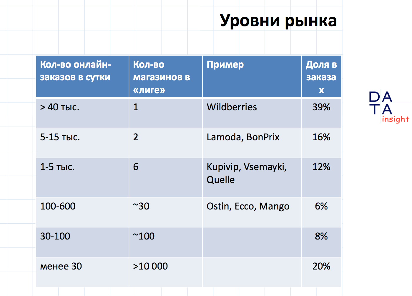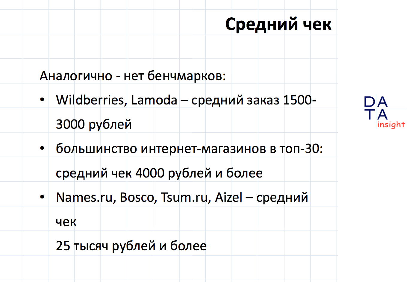 «Высокое число заказов в структуре и низкий объём продаж объясняется тем, что в сегменте низкий средний чек». По данным Data Insight, в среднем российский онлайн-покупатель тратит около 3 200 рублей на один заказ. В целом по рынку онлайн-торговли средний чек при покупках достиг 4 050 рублей в первом полугодии 2016 года.