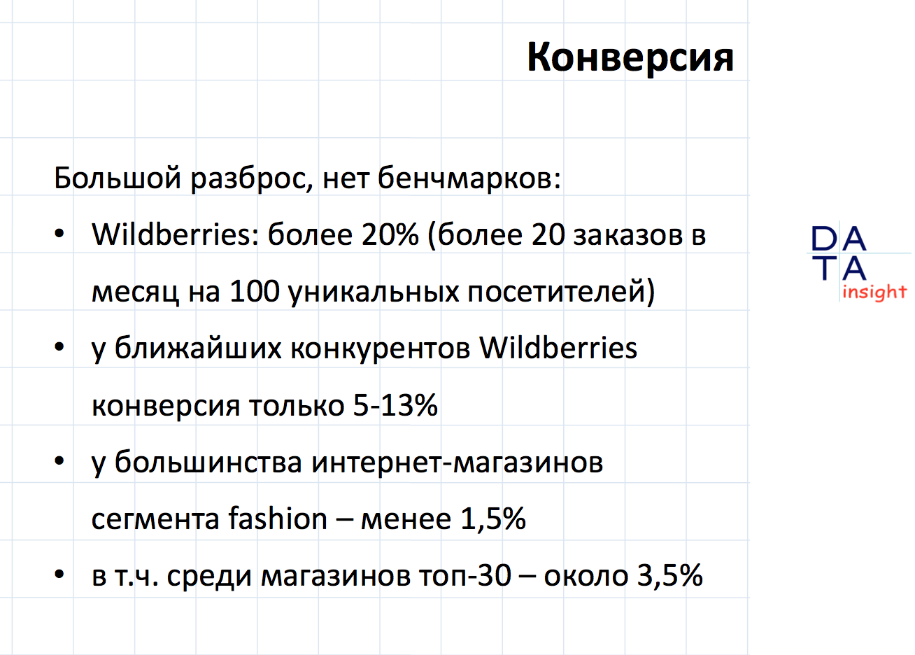 У больших магазинов в модном сегменте потребительская активность кардинально отличается от других категорий. По словам Вирина, здесь выбор магазина крайне важен: покупатель сначала выбирает магазин, и только потом, придя на площадку, выбирает товар. У больших игроков конверсия значительно выше по сравнению с теми магазинами, где важно само предложение.