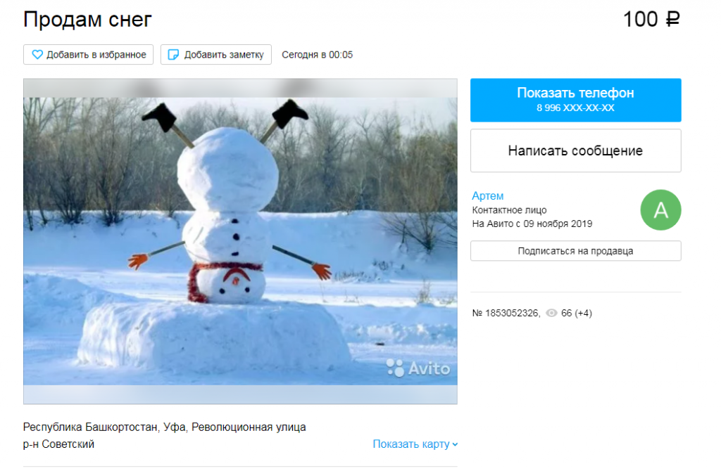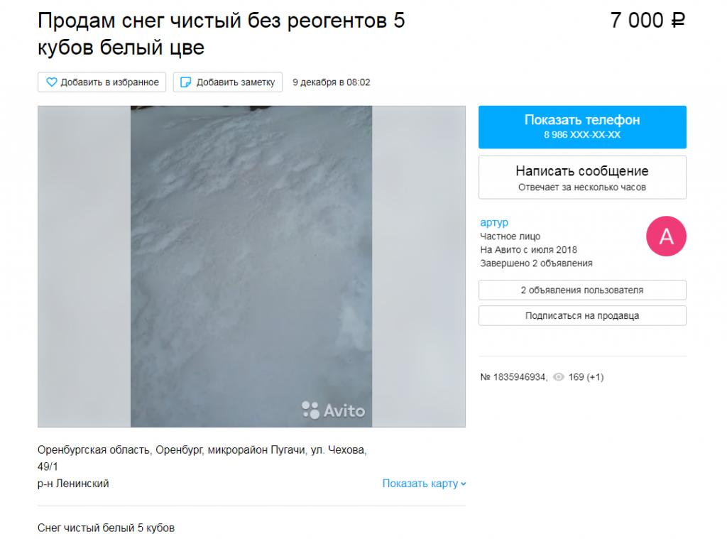 А в Уфе демпингуют, продавая снег по 100 рублей (правда, объём не указан). "Продаю снег нужны деньги на Новый год. Помогите сиротам)", - пишет в объявлении продавец.