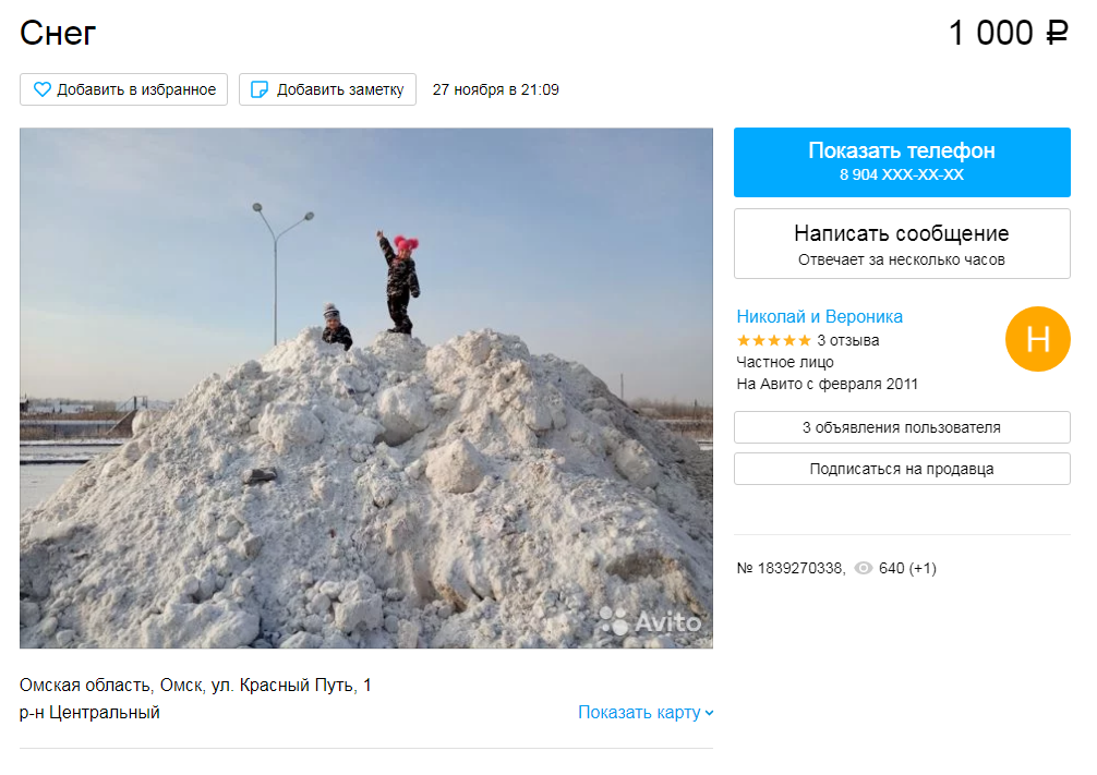 В Омске предлагают снег по цене 1000 рублей за кубометр. " Отличный подарок ребенку любого возраста. Игра в снежки, строительство снежных замков и снеговиков это незабываемая часть детства каждого человека! Подарите своим детям и близким эмоции и воспоминания! Порадуйтесь зимним забавам, почувствуйте новогоднее настроение!" - рекламирует лот продавец.