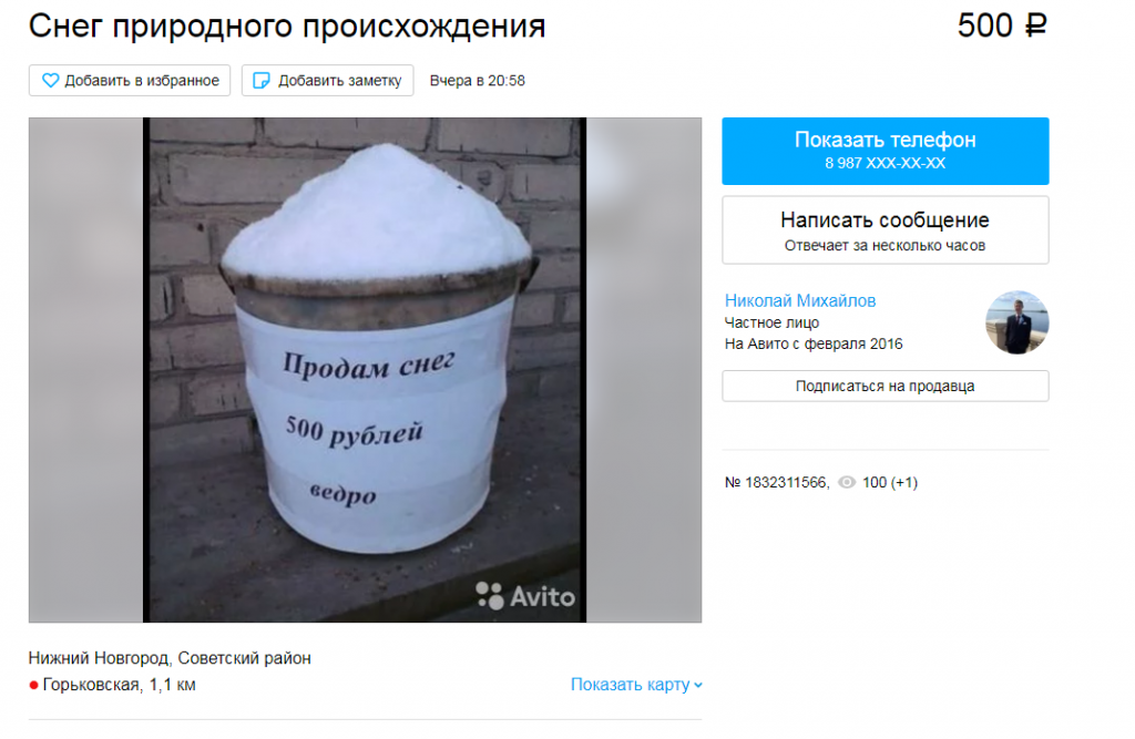 Интересно, что зимой появляются и объявления о покупке снега. Так, в том же Омске готовы брать этот товар при условии, что он будет чистый и белый. "Используем для производства снежных фигур", - пишет покупатель.