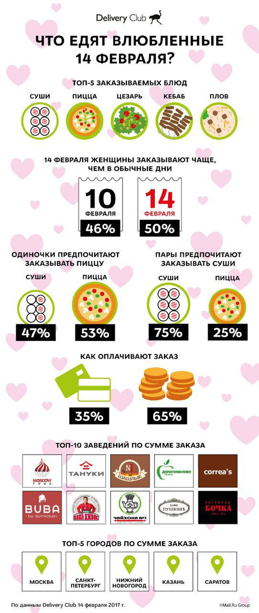 По данным сервиса, для романтического ужина на двоих предпочитали заказывать суши (75%), а одиночки отдавали предпочтение пицце (53%). Количество заказывающих доставку на дом женщин 14 февраля оказалось на 4% больше, чем в обычные дни. В Delivery Club связывают это с тем, что именно они выступали организаторами романтического ужина.