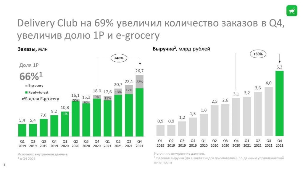 По итогам четвертого квартала 2021 года выручка Delivery Club составила 5,3 млрд рублей, на 69% превысив результат аналогичного квартала 2020 г. и впервые преодолев порог в 5 млрд руб. за квартал. Delivery Club выполнил 26,7 млн заказов в четвертом квартале, что на 48% превысило результат аналогичного периода прошлого года. В декабре 2021 г. сервис впервые в истории выполнил свыше 10 млн транзакций.