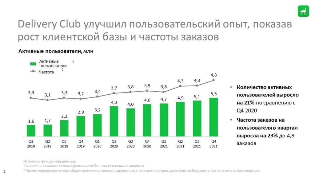 Благодаря развитию операционных технологий Delivery Club в 2021 г. существенно повысил скорость и пунктуальность доставки, что привело к росту активности пользователей и их удовлетворенности. Среднее время доставки в декабре 2021 г. составило 33 минуты, несмотря на повышенную нагрузку и сложные погодные условия. Повысив скорость доставки, Delivery Club позволил клиентам получать готовую еду и продукты из традиционных ресторанов и сетевых магазинов за время, не уступающее сервисам, работающим по модели dark kitchens и dark stores. В результате средняя частота использования сервиса выросла до 4,8 заказов на пользователя в квартал, а количество активных пользователей превысило 5,5 млн (+21% к четвертому кварталу 2020).
