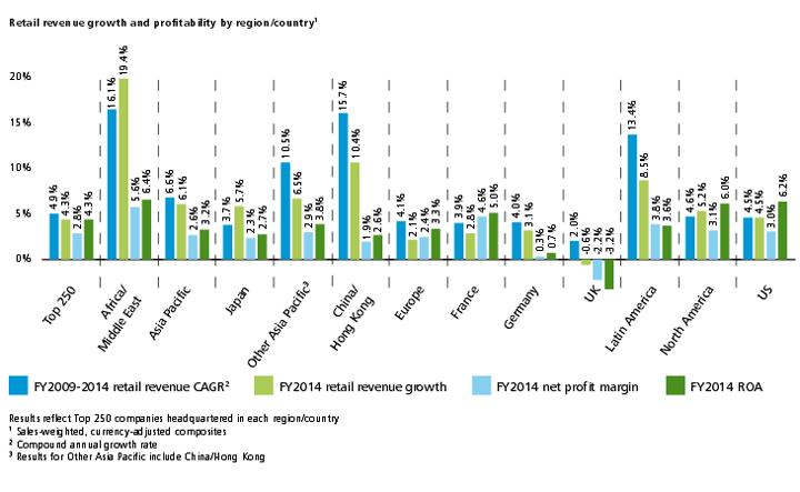 В 2014 финансовом году общая выручка 250 крупнейших ритейлеров составила $4,5 трлн, что на 4,1% больше, чем в предыдущем году, согласно данным отчета «Мировая розничная торговля в 2016 году», представленного компанией Deloitte.