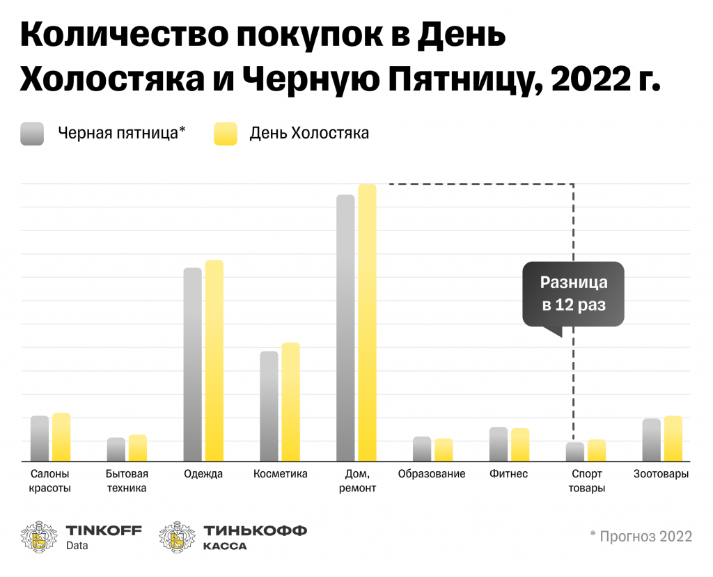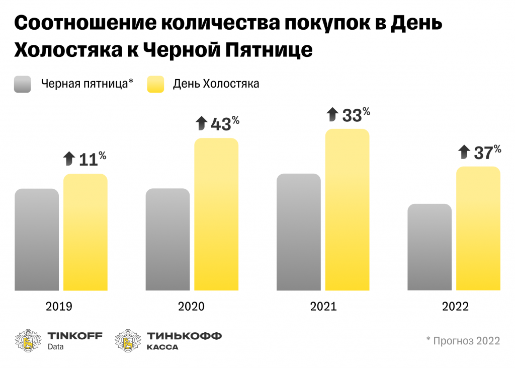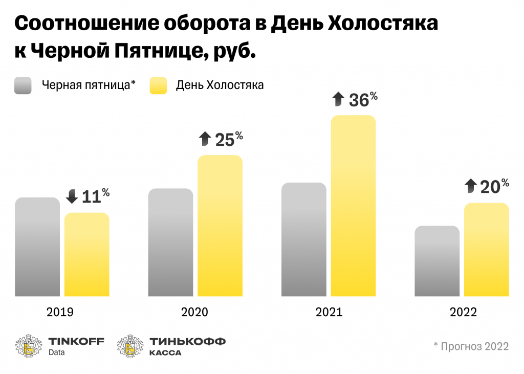 В 2022 году в День холостяка россияне потратили на 20% больше средств и сделали на 37% больше покупок, чем сделают в ближайшую Черную пятницу. Последние четыре года распродажи на День холостяка также выигрывали у Черной пятницы по количеству транзакций, а обороты в Черную пятницу были выше, чем в День холостяка, только в 2019 году.